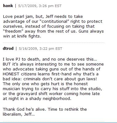 Apparently a few idiots believe that he was robbed because Pearl Jam has supported Democratic candidates in the past, so he is virulently anti-gun rights for everyone and thus he didn't carry a concealed gun at all times and a concealed gun would have magically prevented everything and not escalated the violence... or something.